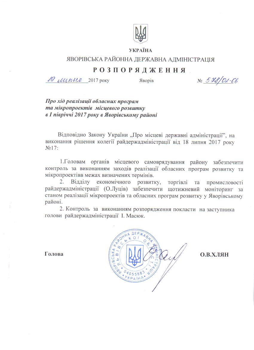 578/02-06 2017-07-25 Про хід реалізації обласних програм та мікропроектів місцевого розвитку в І півріччі 2017 року в Яворівському районі