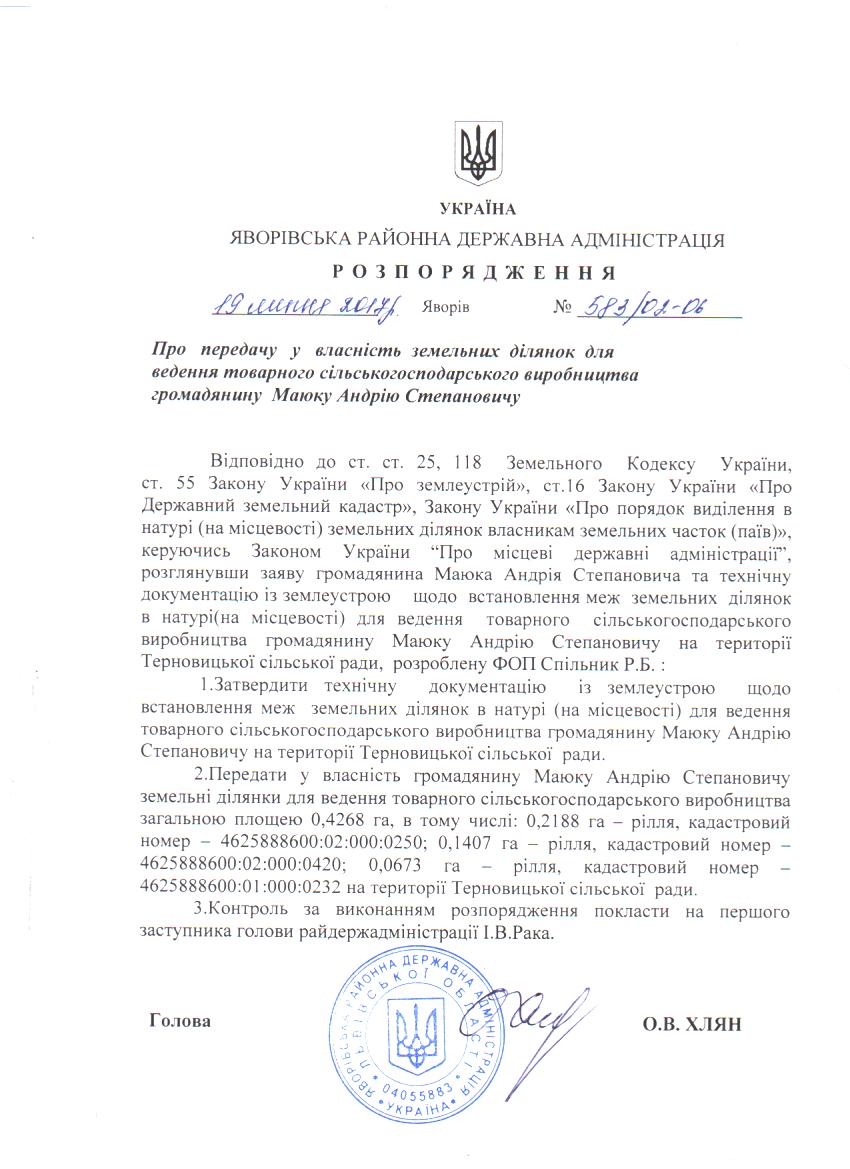 583/02-06 2017-07-25 Про передачу у власність земельних ділянок для ведення товарного сільськогосподарського виробництва громадянину Маюку Андрію Степановичу