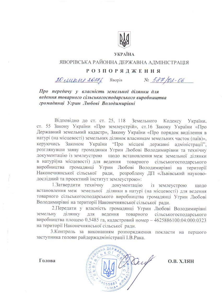 587/02-06 2017-07-26 Про передачу у власність земельної ділянки для ведення товарного сільськогосподарського виробництва громадянці Угрин Любові Володимирівні