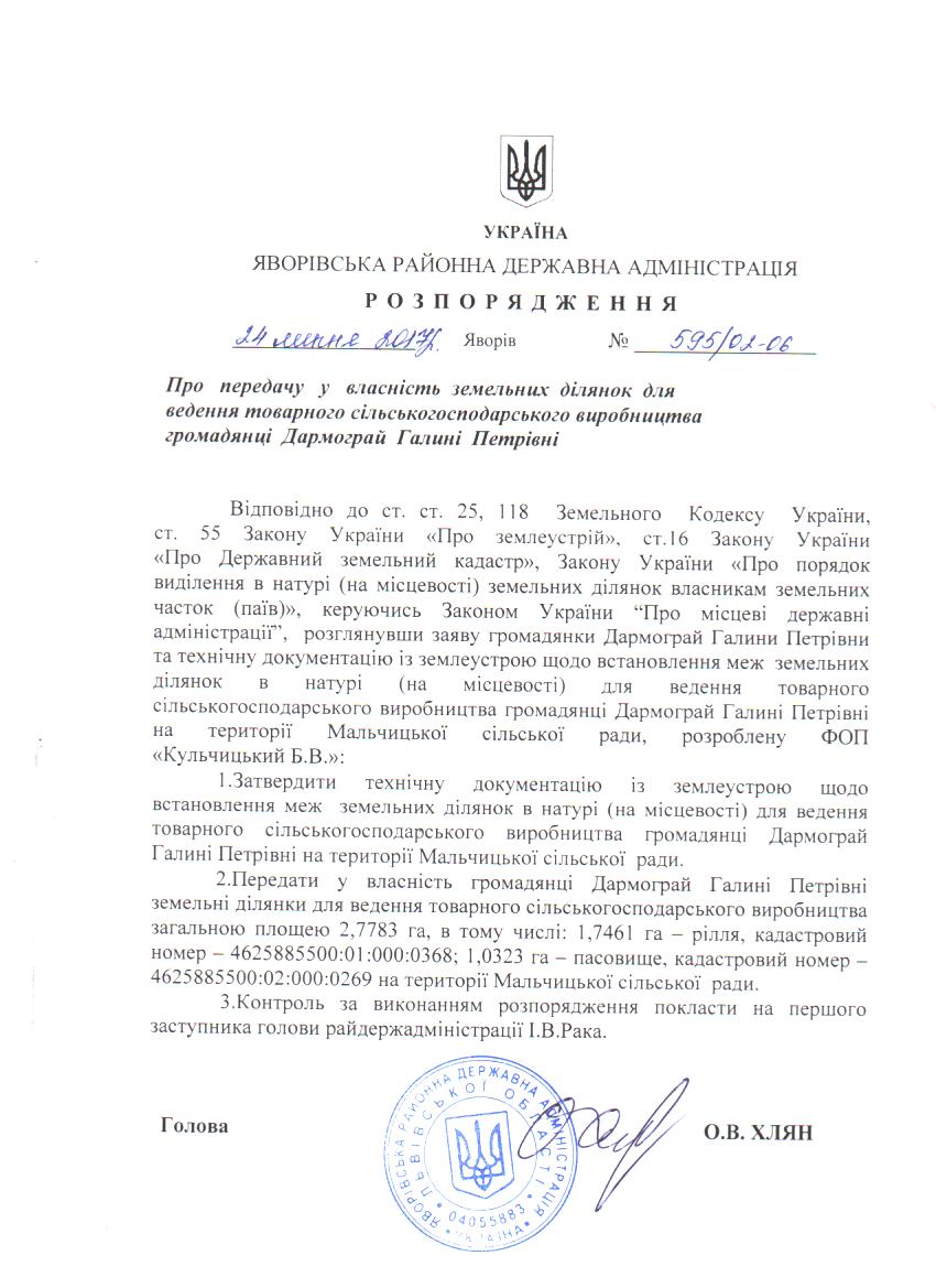 595/02-06 2017-07-28 Про передачу у власність земельних ділянок для ведення товарного сільськогосподарського виробництва громадянці Дармограй Галині Петрівні
