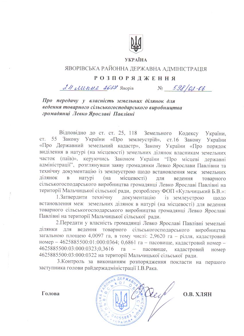 598/02-06 2017-07-28 Про передачу у власність земельних ділянок для ведення товарного сільськогосподарського вирбництва громадянці Левко Ярославі Павлівні