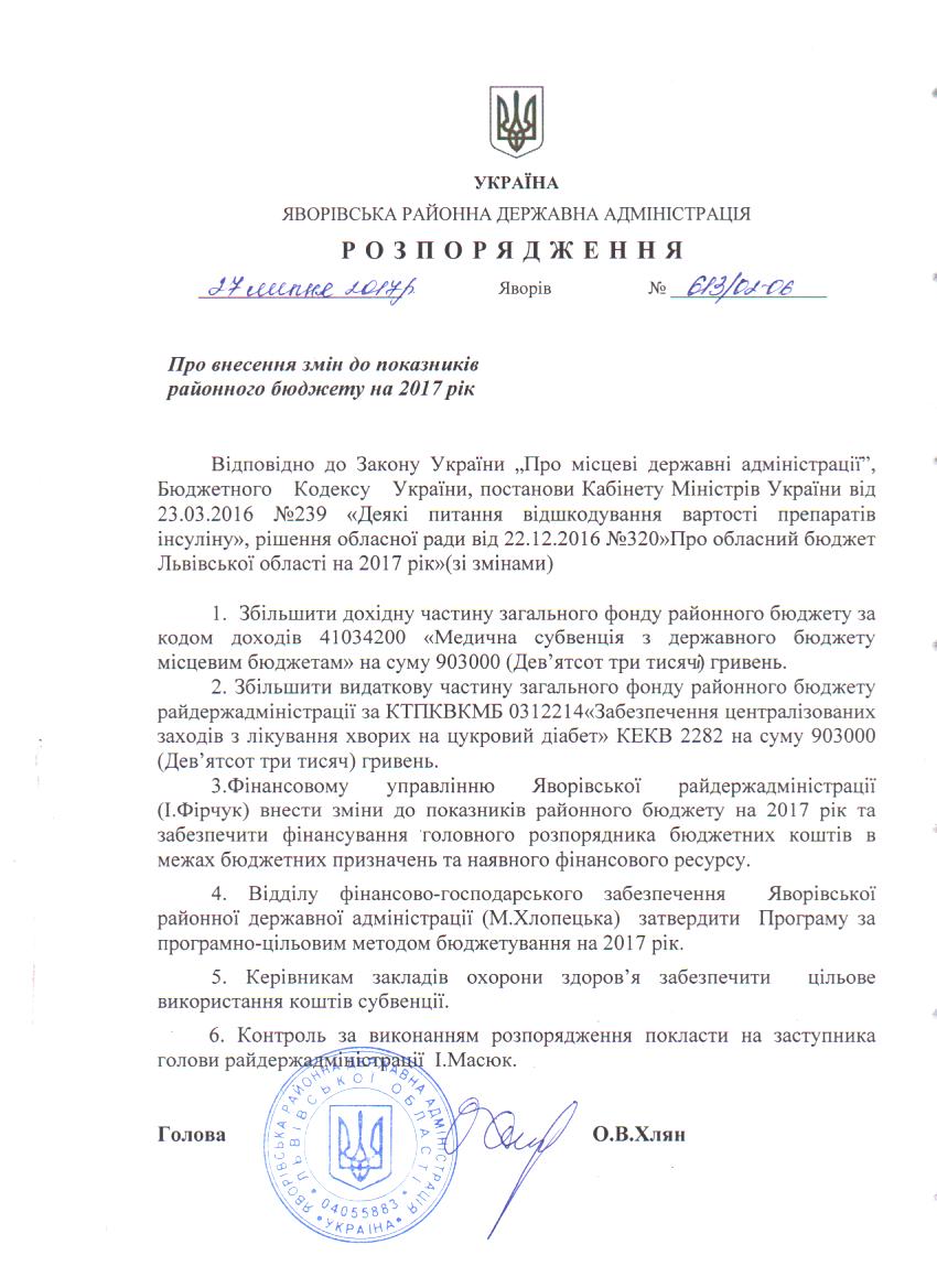 613/02-06 2017-07-31 Про внесення змін до показників районного бюджету на 2017 рік