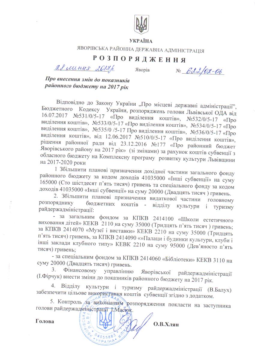 622/02-06 2017-08-02 Про внесення змін до показників районного бюджету на 2017 рік
