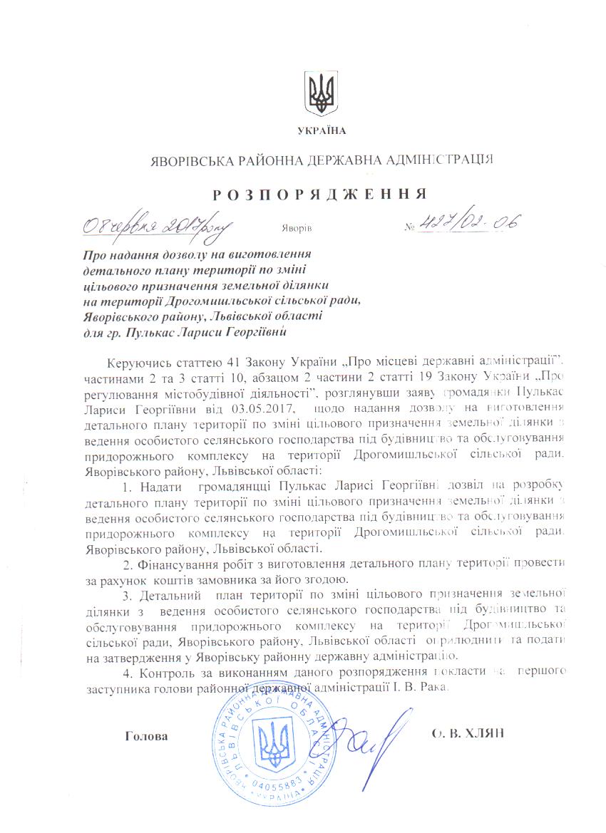 427/02-06 2017-06-12 Про надання дозволу на виготовлення детального плану території по зміні цільового призначення земельної ділянки на території Дрогомишльської сільської ради, Яворівського району, Львівської області гр. Пулькас Лариси Георгіївни