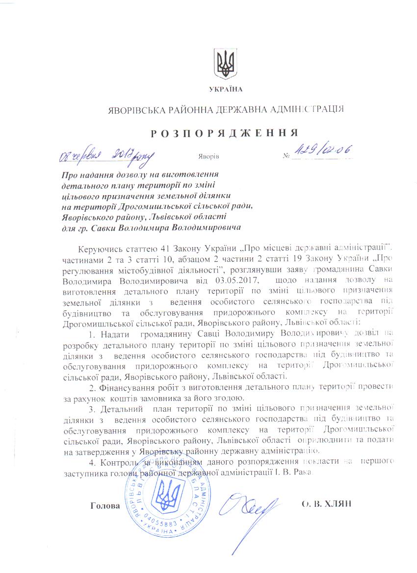 429/02-06 2017-06-12 Про надання дозволу на виготовлення детального плану території по зміні цільового призначення земельної ділянки на території Дрогомишльської сільської ради, Яворівського району, Львівської області для гр. Савки Володимира Володимировича