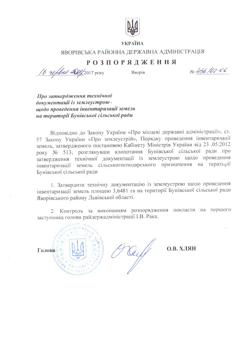 456/02-06 2017-06-22 Про затвердження технічної документації із землеустрою щодо проведення інвентаризації земель на території Бунівської сільської ради