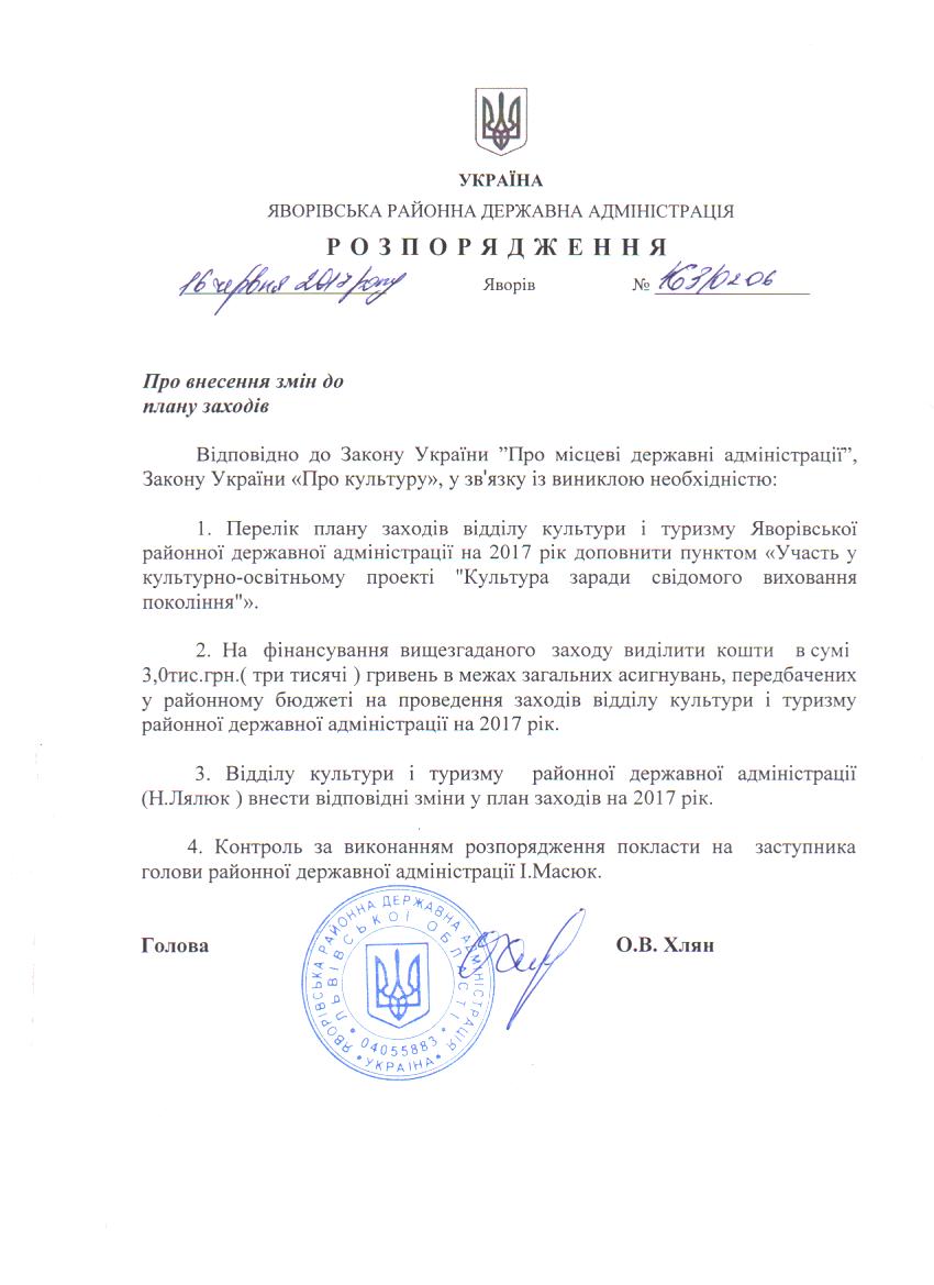 436/02-06 2017-06-15 Про внесення змін до штатного розпису установ культури Яворівського району