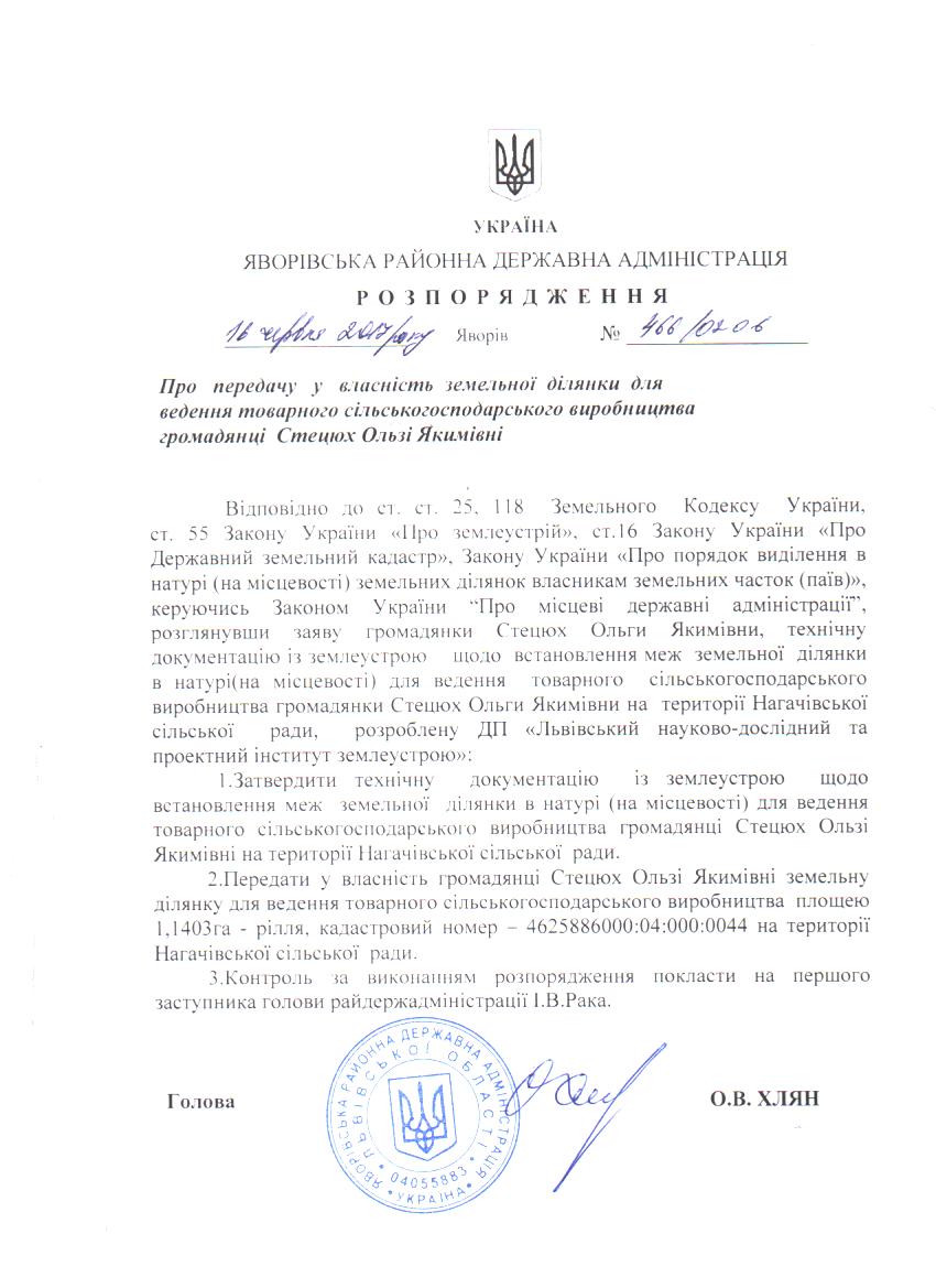 466/02-06 2017-06-22 Про передачу у власність земельної ділянки для ведення товарного сільськогосподарського виробництва громадянці Стецюх Ользі Якимівні