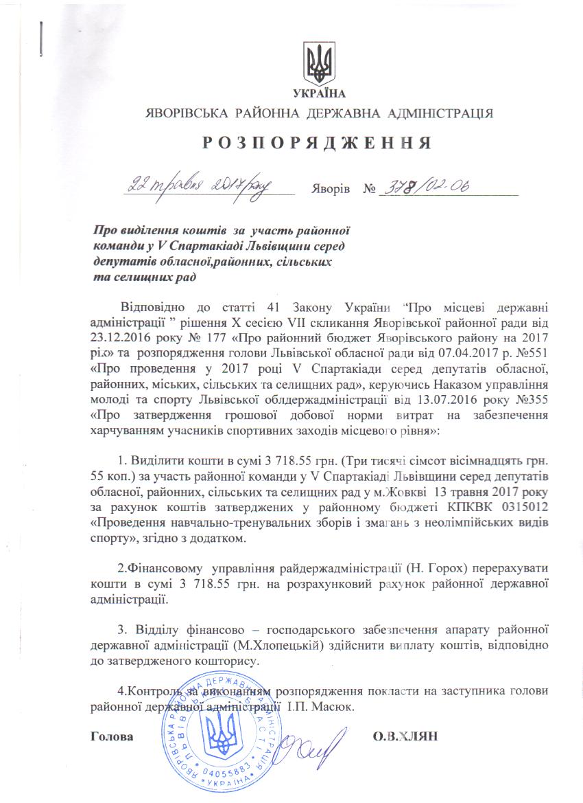 378/02-06 2017-05-26 Про виділення коштів за участь районної команди у V Спартакіаді Львівщини серед депутатів обласної, районних, сільських та селищних рад