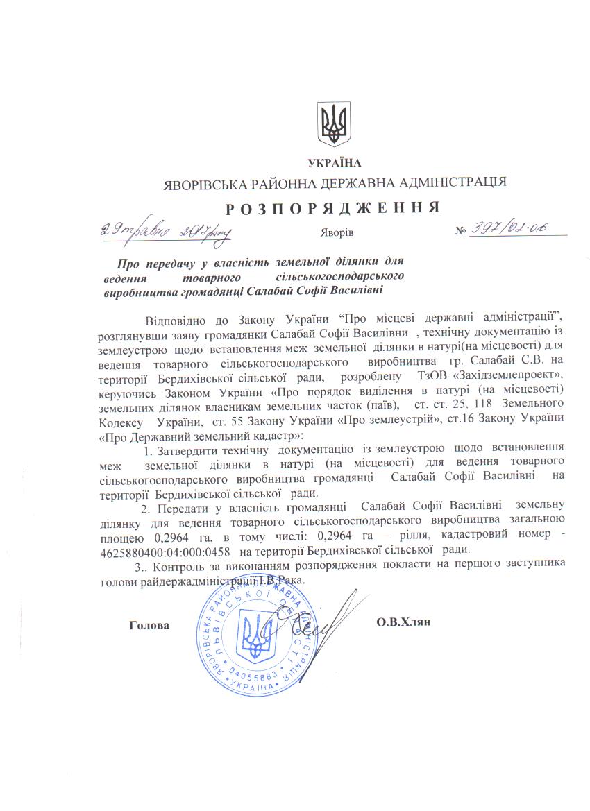 397/02-06 2017-06-02 Про передачу у власність земельної ділянки для ведення товарного сільськогосподарського виробництва громадянці Салабай Софії Василівні