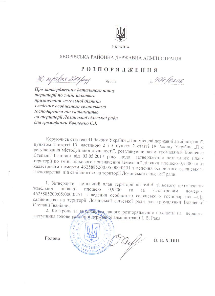 404/02-06 2017-06-02 Про затвердження детального плану території по зміні цільового призначення земельної ділянки з ведення особистого селянського господарства під садівництво на території Лозинської сільської ради для громадянки Вовненко С. І.