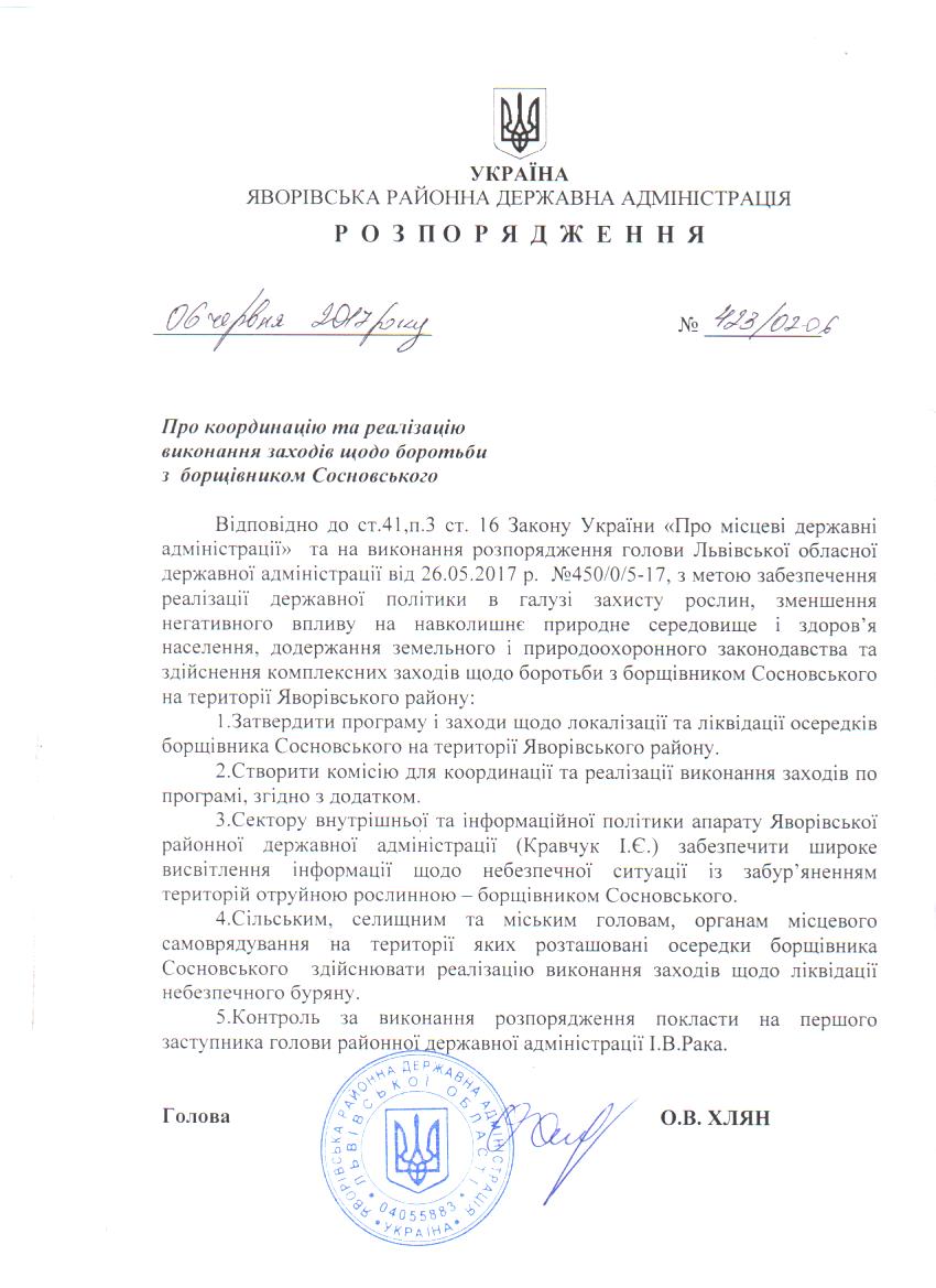423/02-06 2017-06-09 Про координацію та реалізацію виконання заходів щодо боротьби з борщівником Сосновського