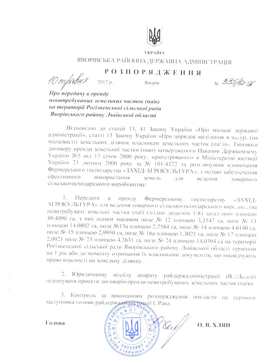 335/02-06 2017-05-15 Про передачу в оренду невитребуваних земельних часток (паїв) на території Рогізненської сільської ради Яворівського району Львівської області