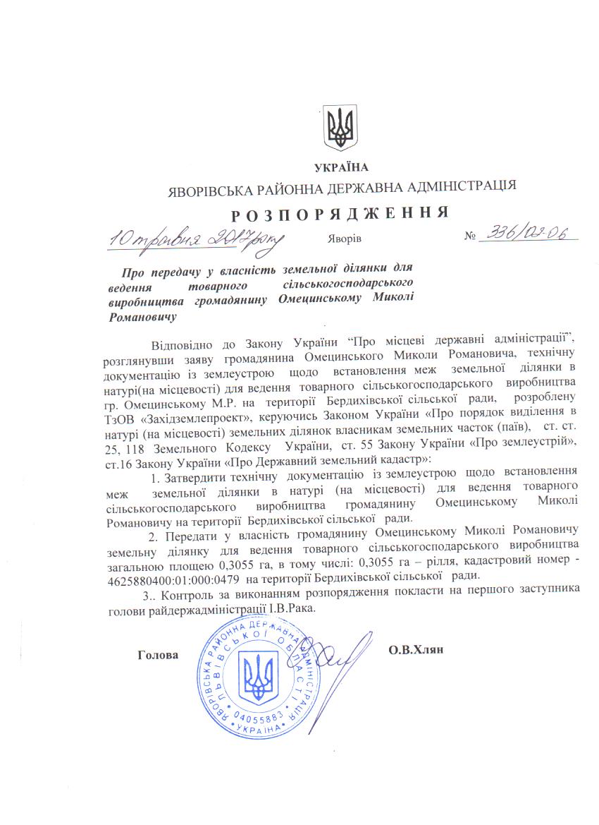 336/02-06 2017-05-15 Про передачу у власність земельної ділянки для ведення товарного сільськогосподарського виробництва громадянину Омецинському Миколі Романовичу