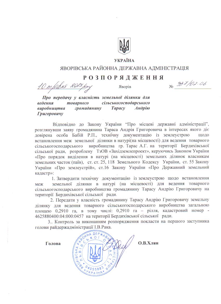 337/02-06 2017-05-15 Про передачу у власність земельної ділянки для ведення товарного сільськогосподарського виробництва громадянину Тарасу Андрію Григоровичу