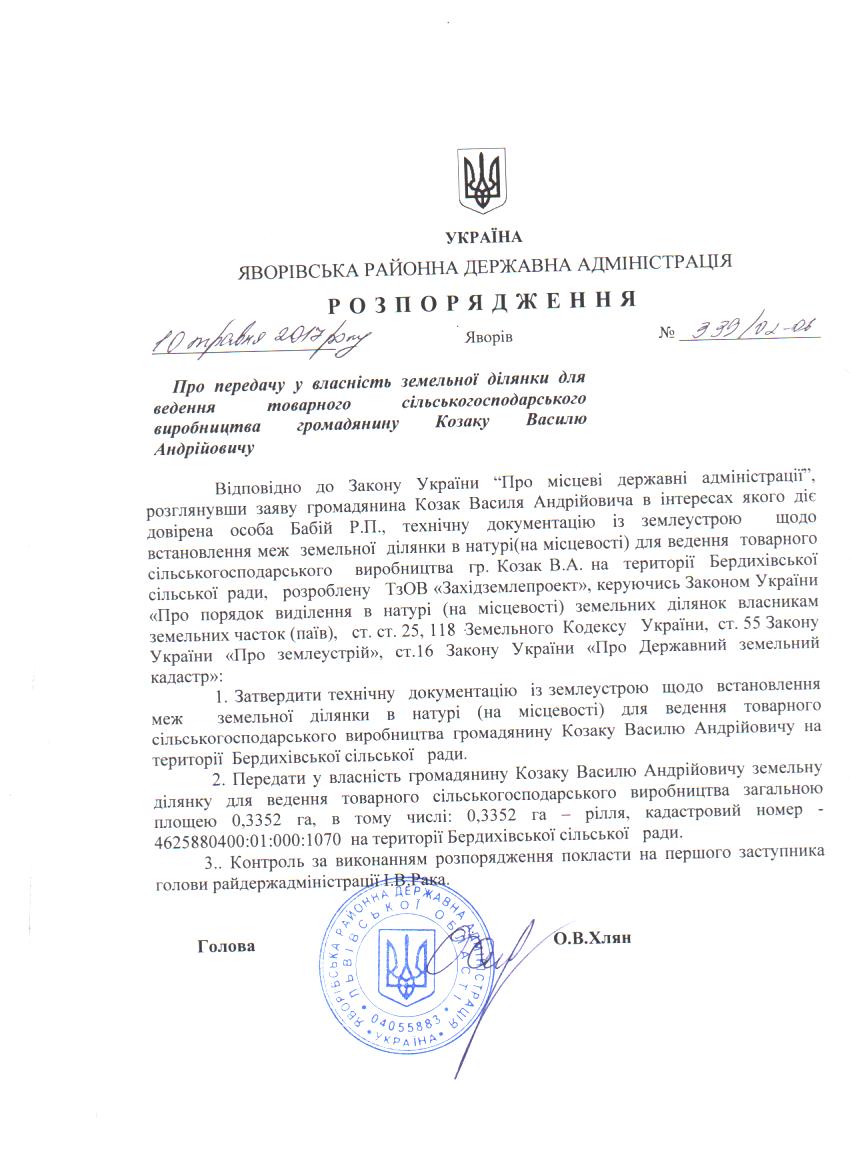 339/02-06 2017-05-15 Про передачу у власність земельної ділянки для ведення товарного сільськогосподарського виробництва громадянину Козаку Василю Андрійовичу