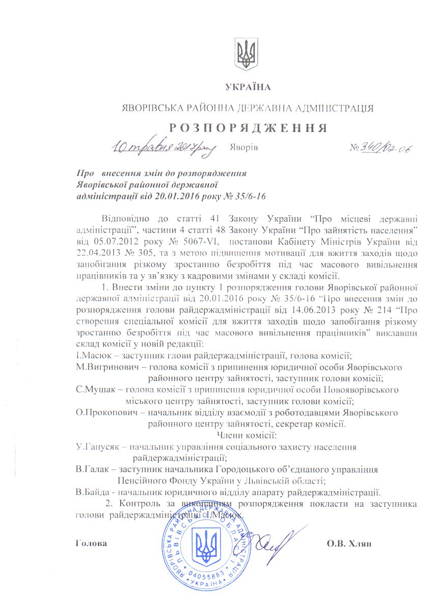 340/02-06 2017-05-15 Про внесення змін до розпорядження Яворівської районної державної адміністрації від 20.01.2016 року №35/6-16