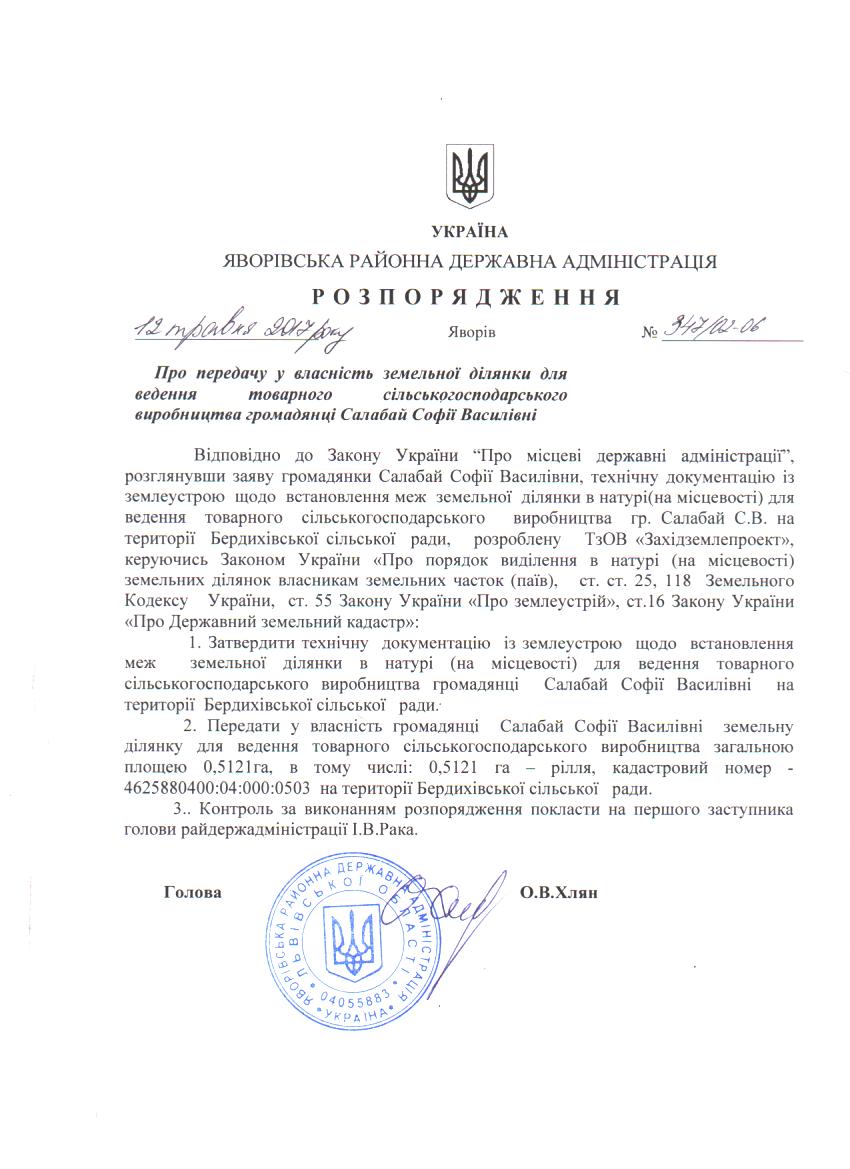 347/02-06 2017-05-15 Про передачу у власність земельної ділянки для ведення товарного сільськогосподарського виробництва громадянці Салабай Софії Василівні