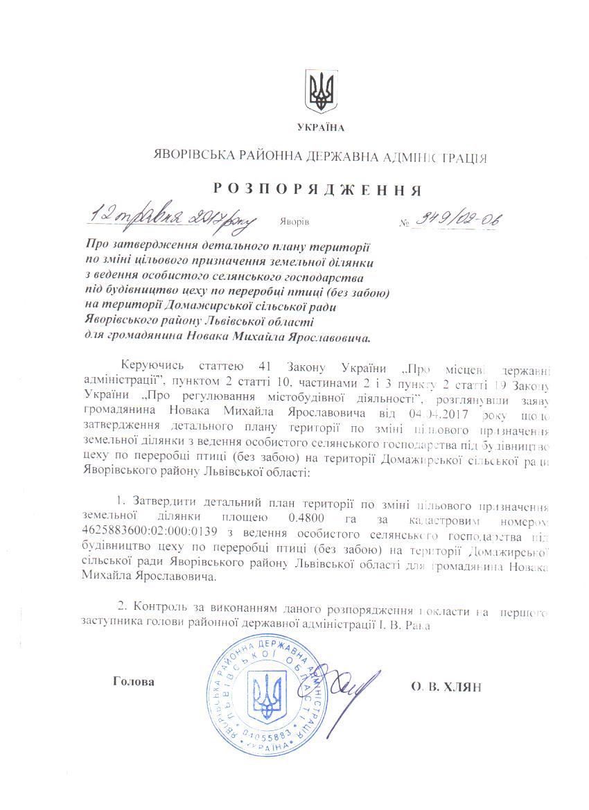 349/02-06 2017-05-15 Про затвердження детального плану території по зміні цільового призначення земельної ділянки з ведення особистого селянського господарства під будівництво цеху по переробці птиці (без забою) на території Домажирської сільської ради Яворівського району Львівської області для громадянина Новака Михайла Ярославовича