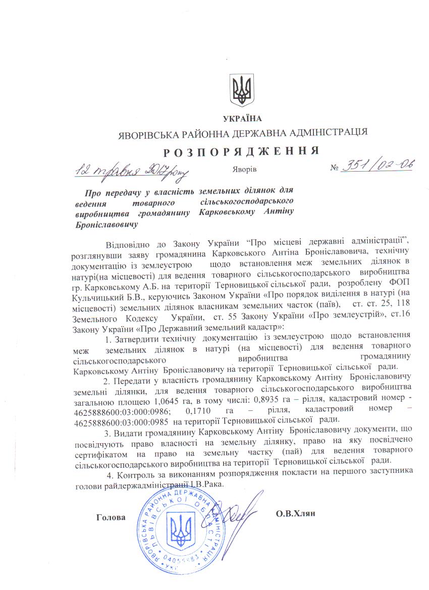 351/02-06 2017-05-15 Про передачу у власність земельних ділянок для ведення товарного сільськогосподарського виробництва громадянину Карковському Антіну Броніславовичу