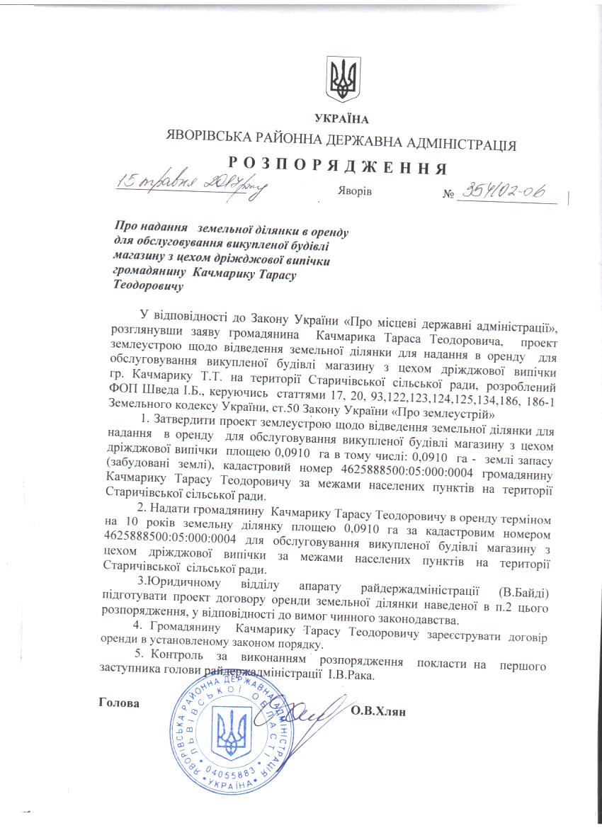 354/02-06 2017-05-19 Про надання земельної ділянки в оренду для обслуговування викупленої будівлі магазину з цехом дріжджової випічки громадянину Качмарику Тарасу Теодоровичу