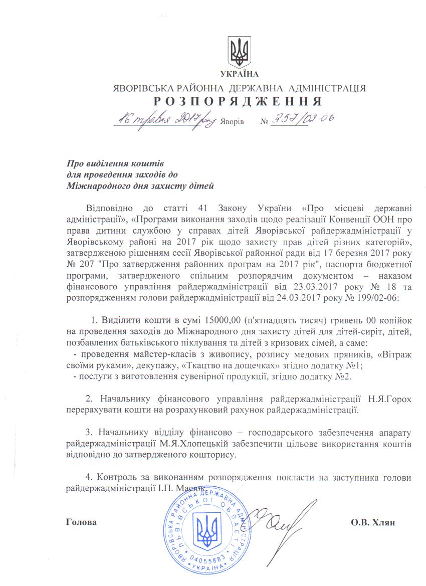357/02-06 2017-05-19 Про виділення коштів для проведення заходів до Міжнародного дня захисту дітей
