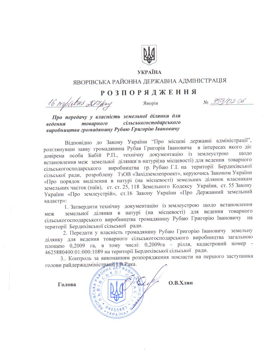 359/02-06 2017-05-19 Про передачу у власність земельної ділянки для ведення товарного сільськогосподарського виробництва громадянину Рубаю Григорію Івановичу