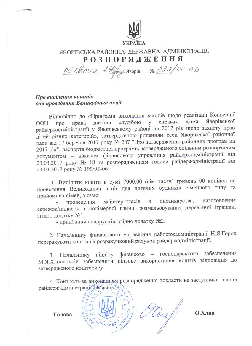 227/02-06 2017-04-10 Про виділення коштів для проведення Великодньої акції