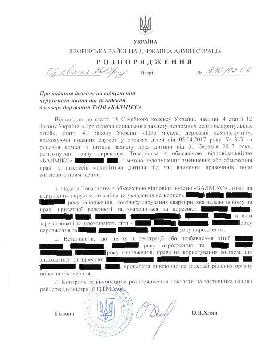 230/02-06 2017-04-10 Про надання дозволу на відчуження нерухомого майна та укладення договору дарування ТзОВ "Балмікс"