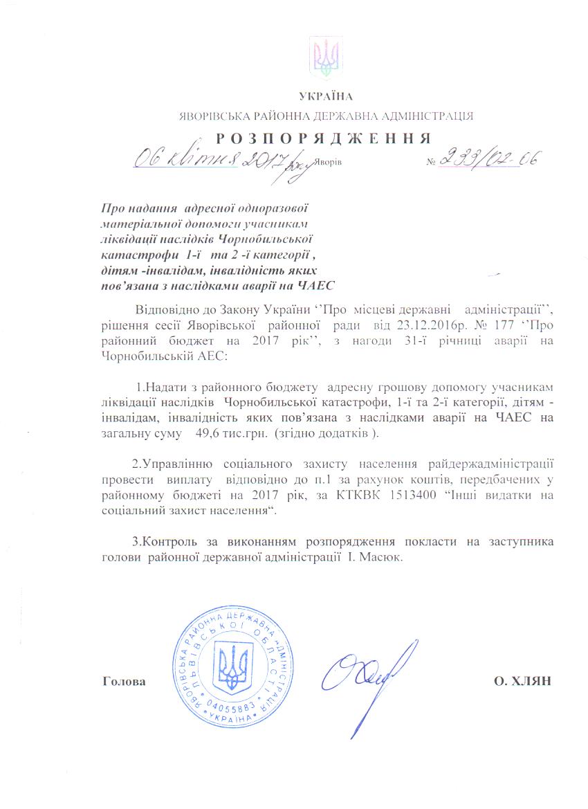 233/02-06 2017-04-10 Про надання адресної одноразової матеріальної допомоги учасникам ліквідації наслідків Чорнобильської катастрофи 1-ї та 2-ї категорії, дітям-інвалідам, інвалідність яких пов'язана з наслідками аварії на ЧАЕС