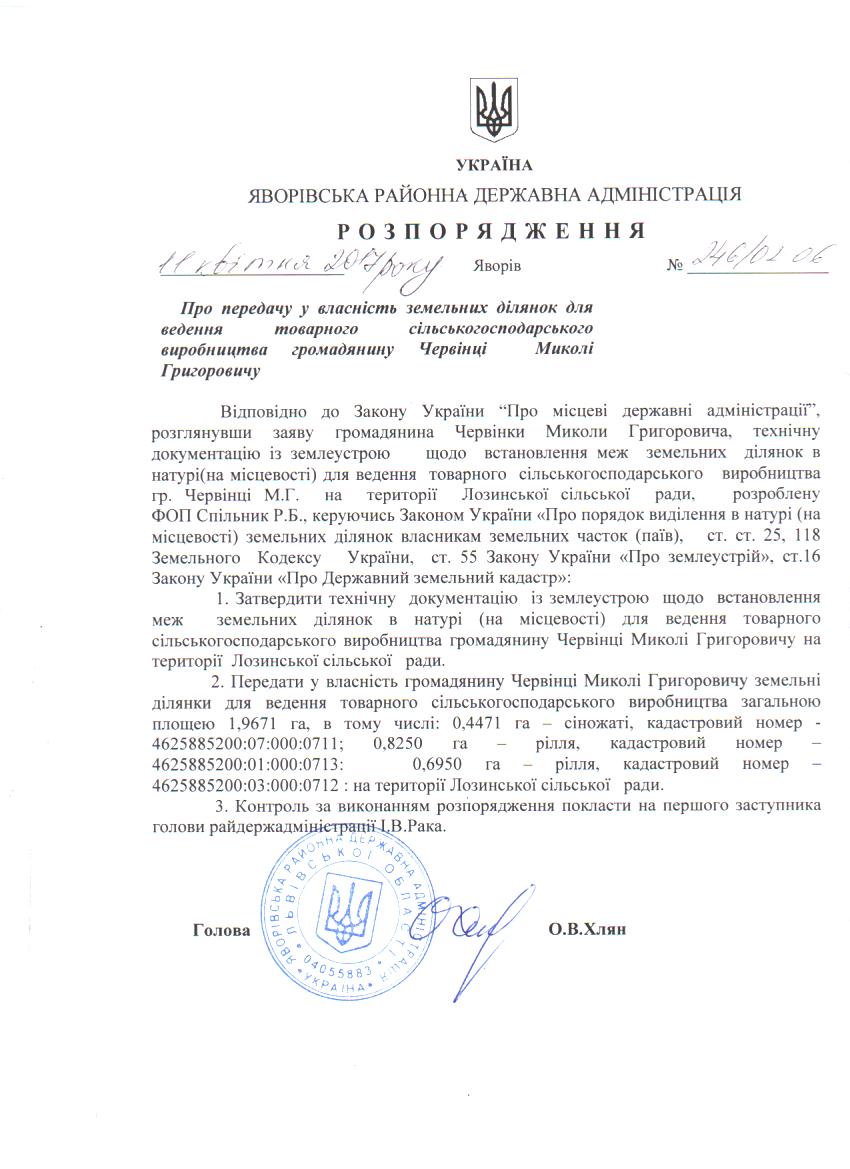 246/02-06 2017-04-18 Про передачу у власність земельних ділянок для ведення товарного сільськогосподарського виробництва громадянину Червінці Миколі Григоровичу
