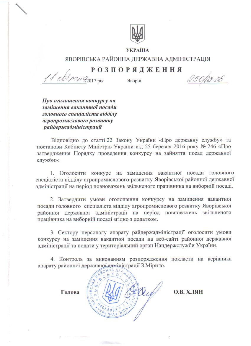 250/02-06 2017-04-18 Про оголошення конкурсу на заміщення вакантної посади головного спеціаліста відділу агропромислового розвитку райдержадміністрації