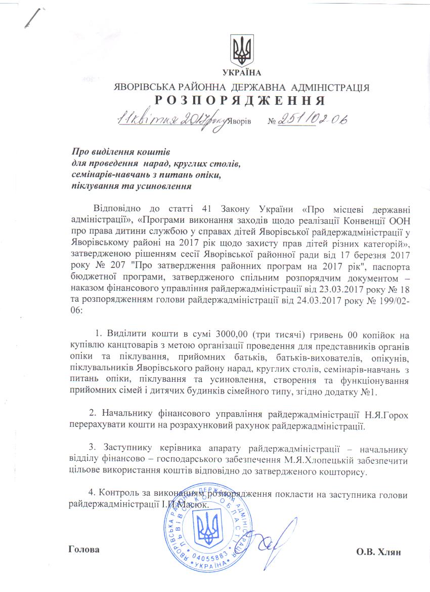 251/02-06 2017-04-18 Про виділення коштів для проведення нарад, круглих столів, семінарів-навчань з питань опіки, піклування та усиновлення