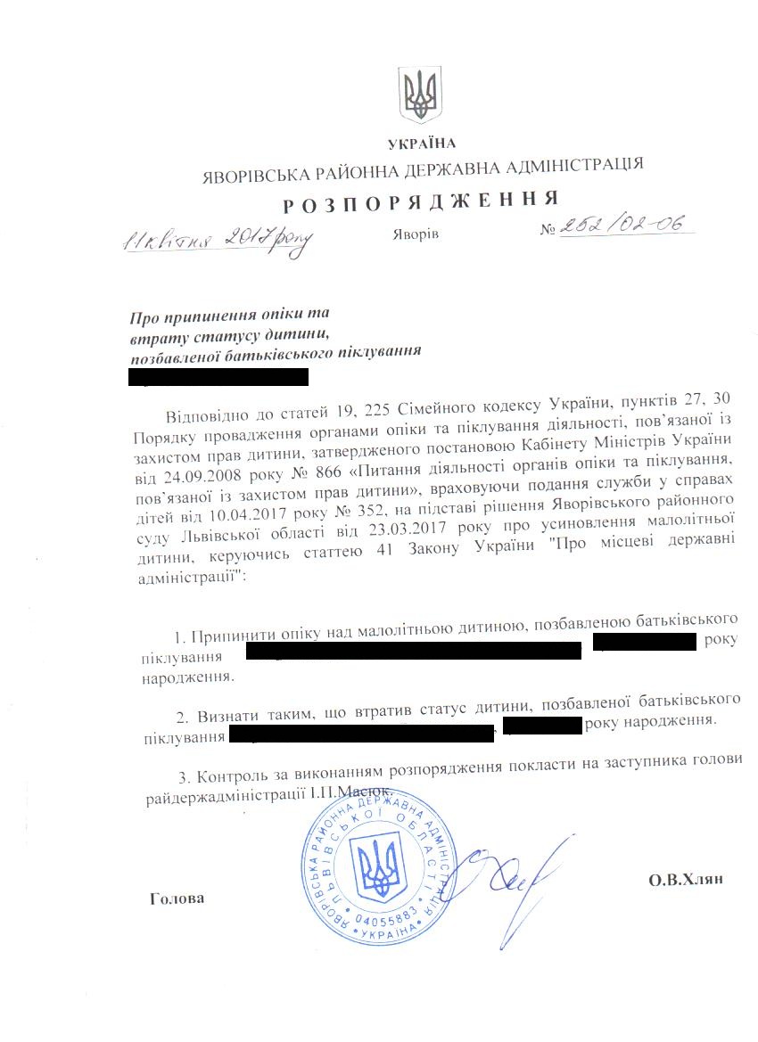 252/02-06 2017-04-18 Про припинення опіки та втрату статусу дитини, позбавленої батьківського піклування