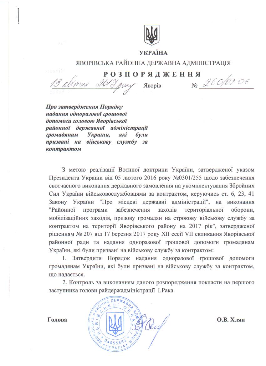 260/02-06 2017-04-20 Про затвердження Порядку надання одноразової грошової допомоги головою Яворівської районної державної адміністрації громадянам України, які були призвані на військову службу за контрактом
