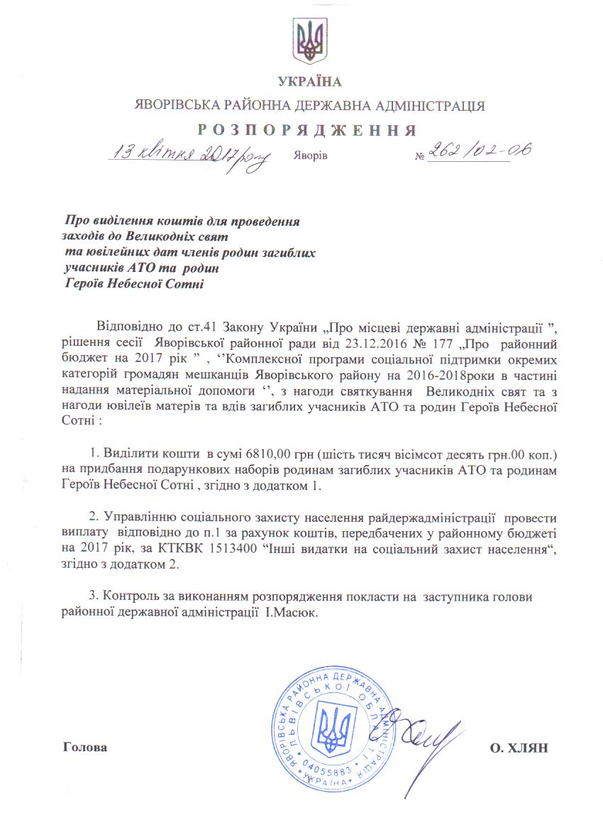 262/02-06 2017-04-20 Про виділення коштів для проведення заходів до Великодніх свят та ювілейних дат членів родин загиблих учасників АТО та родин Героїв Небесної Сотні