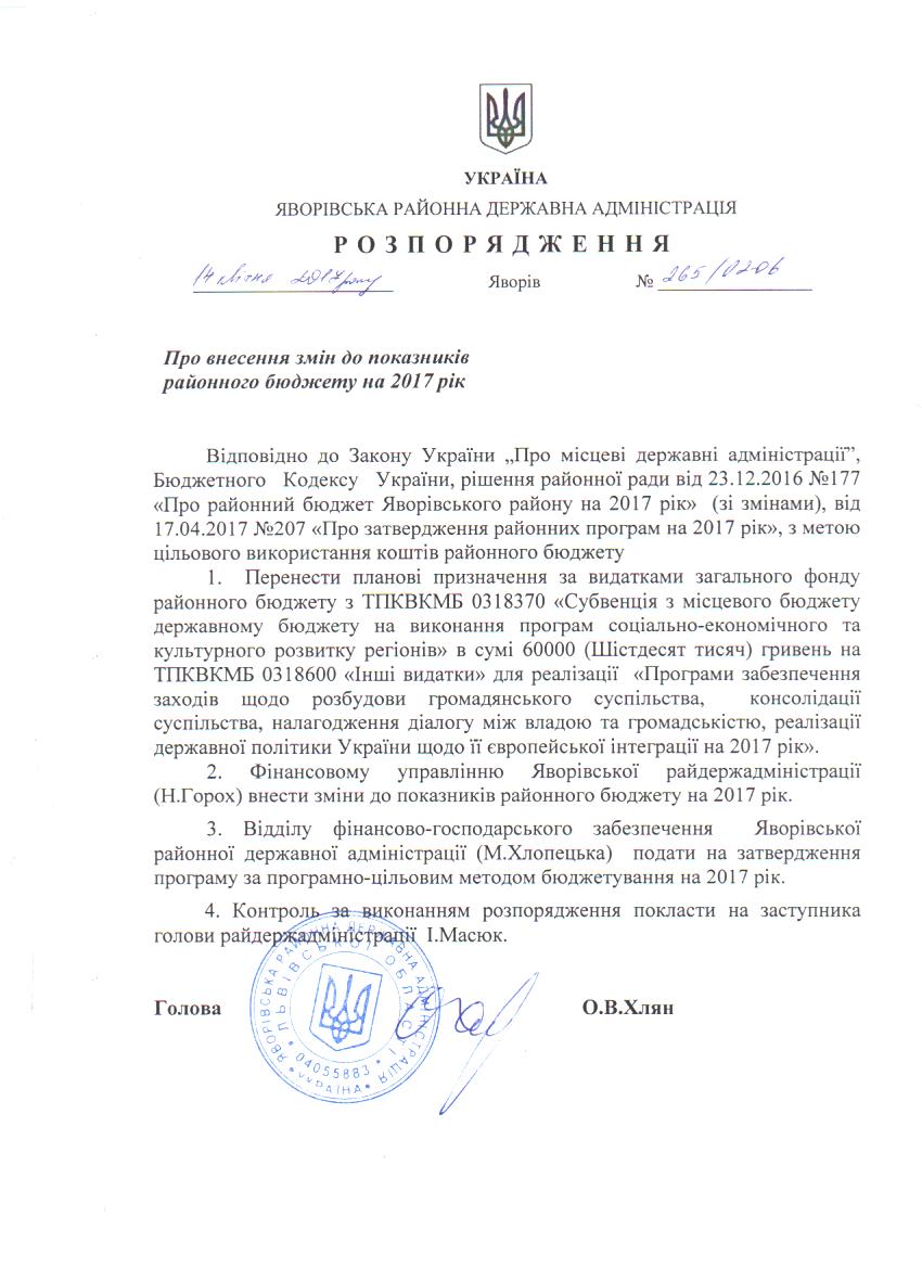 265/02-06 2017-04-21 Про внесення змін до показників районного бюджету на 2017 рік