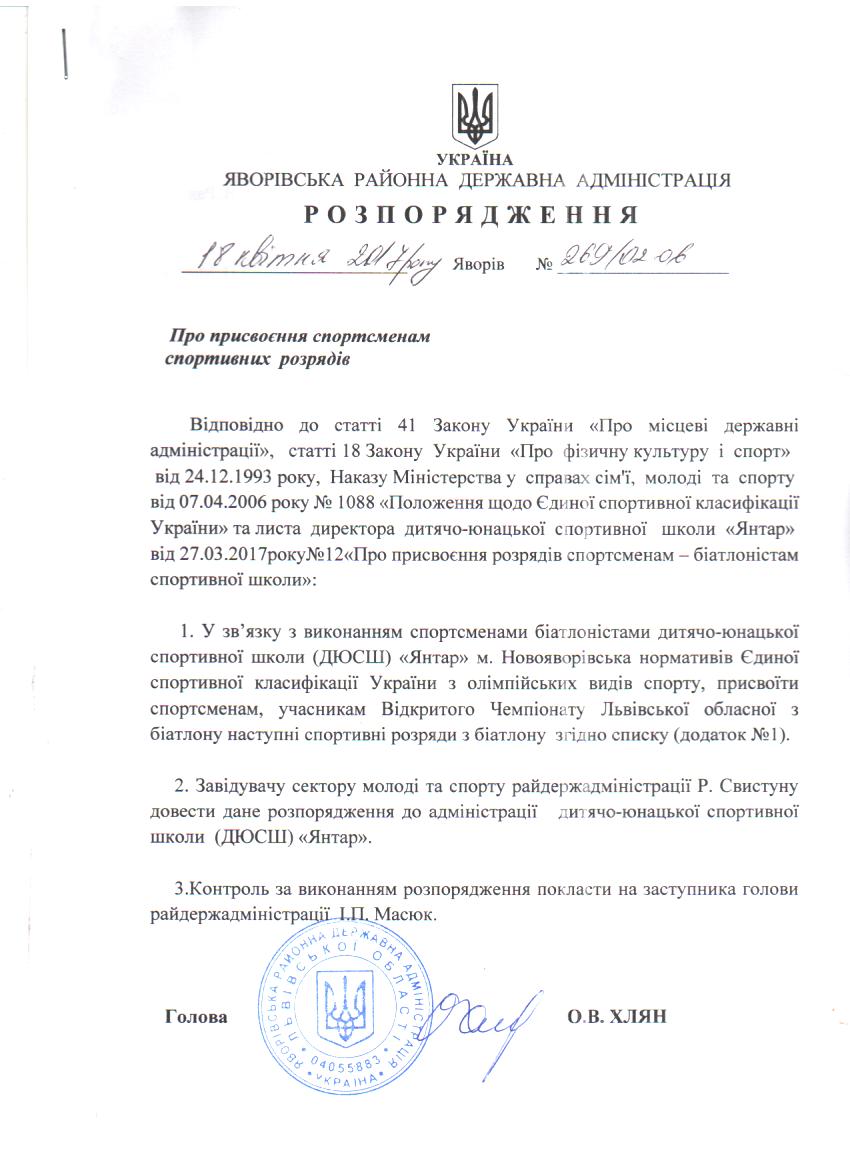 269/02-06 2017-04-24 Про присвоєння спортсменам спортивних розрядів