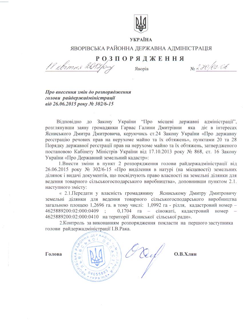 270/02-06 2017-04-24 Про внесення змін до розпорядження голови райдержадміністрації від 26.06.2015 року № 302/6-15