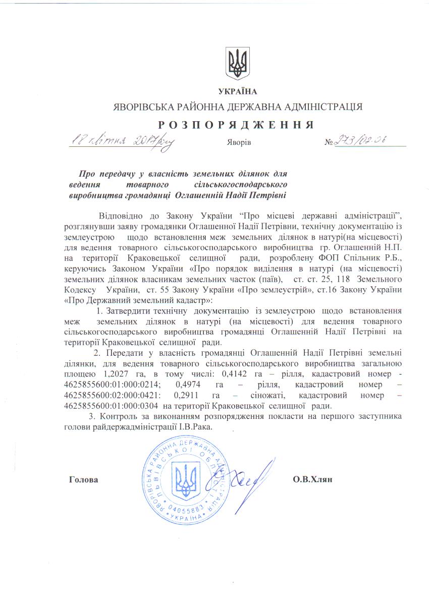 273/02-06 2017-04-24 Про передачу у власність земельних ділянок для ведення товарного сільськогосподарського виробництва громадянці Оглашенній Надії Петрівні