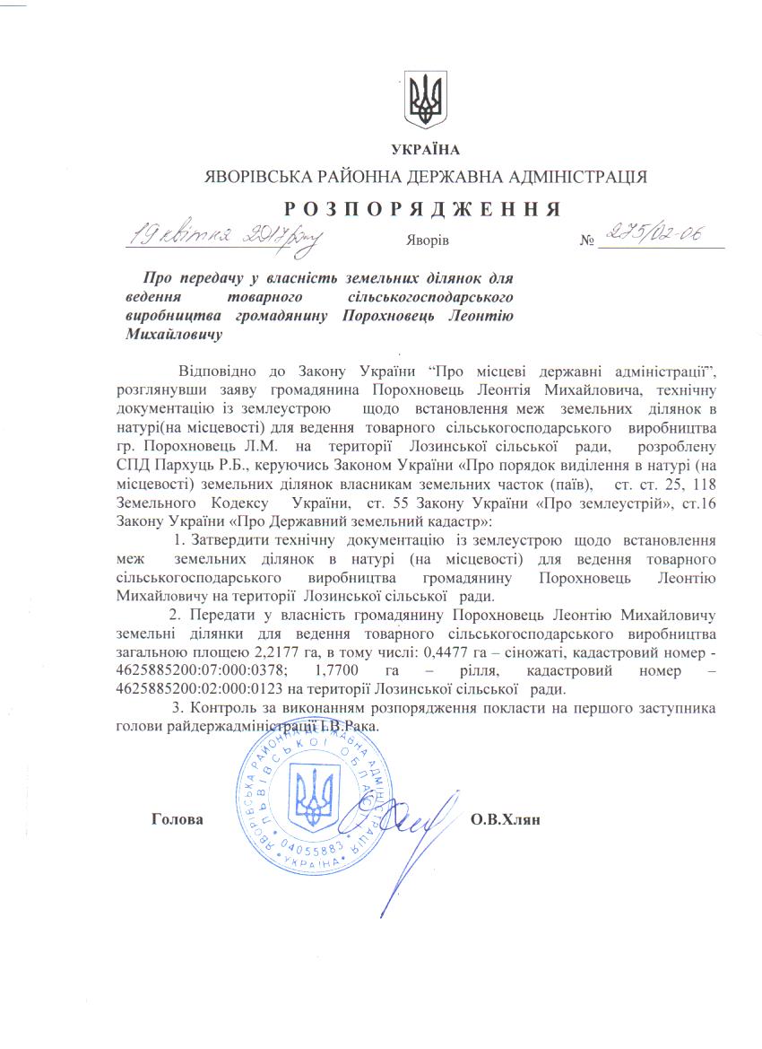 275/02-06 2017-04-25 Про передачу у власність земельних ділянок для ведення товарного сільськогосподарського виробництва громадянину Порохновець Леонтію Михайловичу