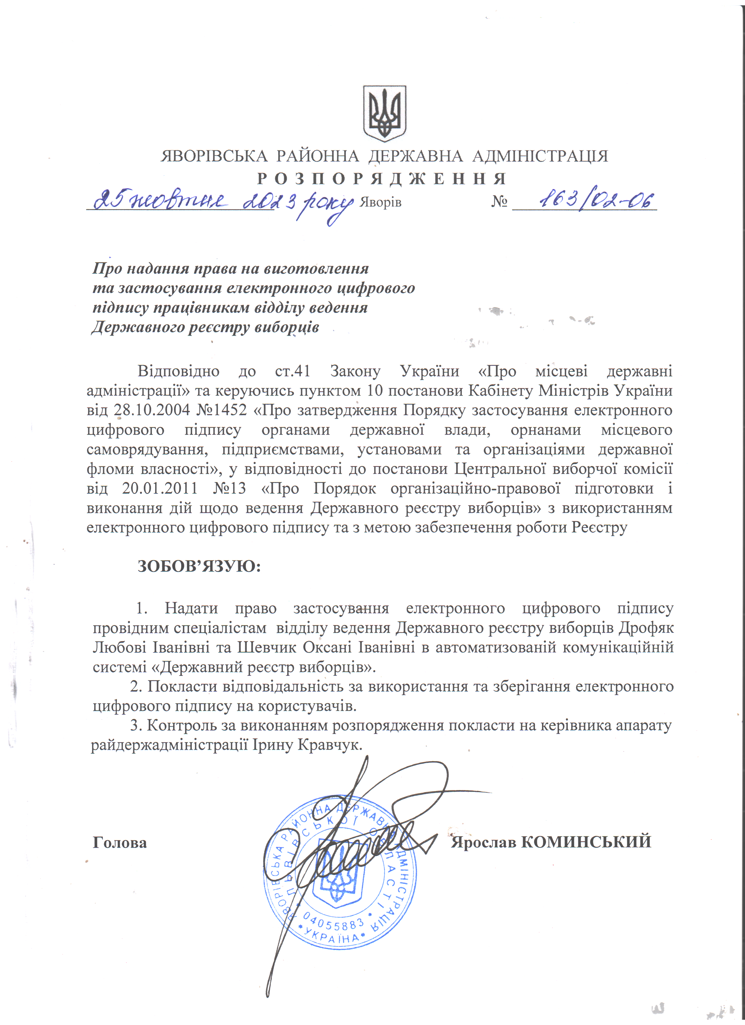 163/02-06 2023-10-25 Про надання права на виготовлення та застосування електронного цифрового підпису працівникам відділу ведення Державного реєстру виборців Відповідно до ст.41 Закону