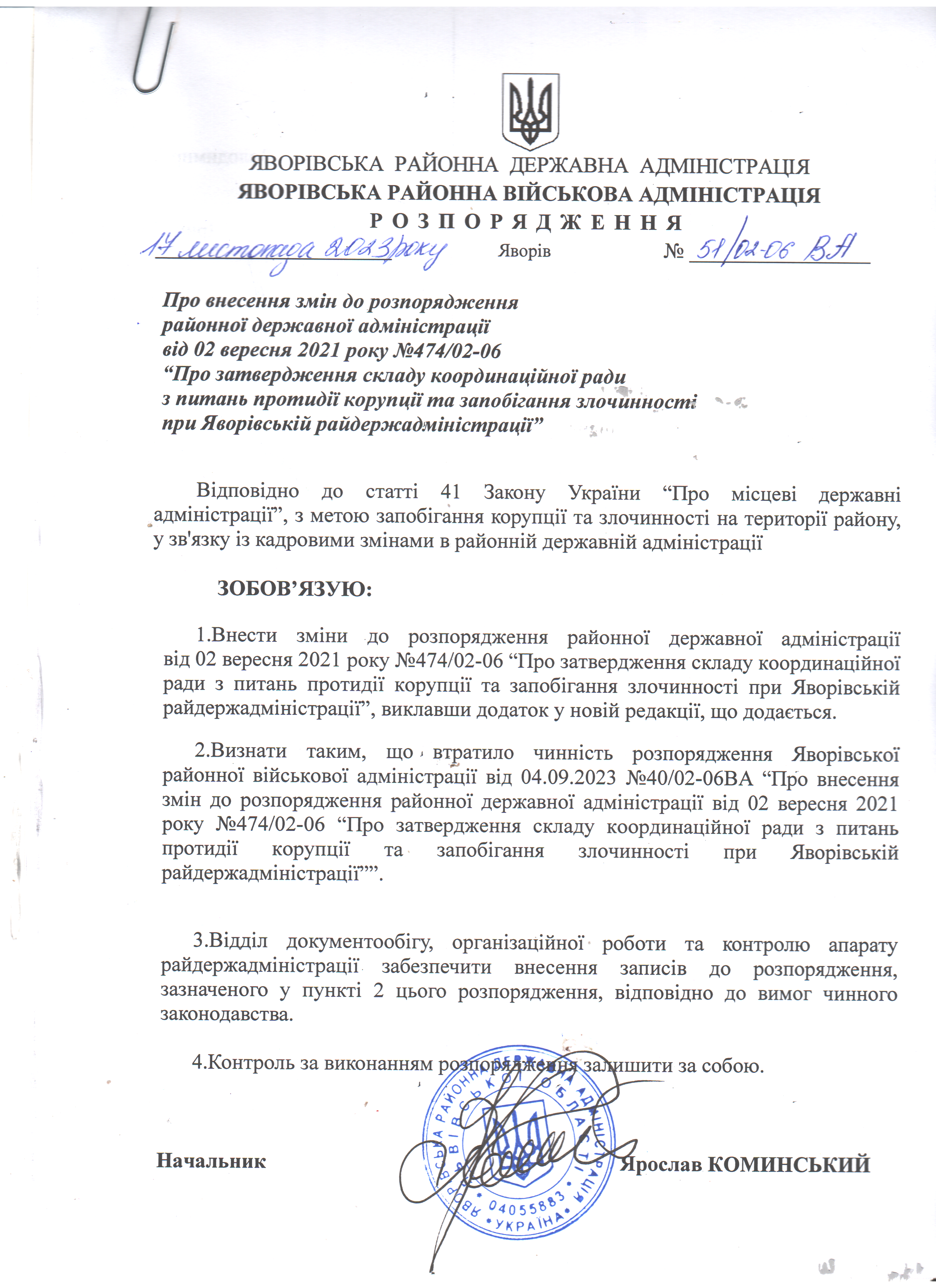 51/02-06 ВА 2023-11-17 Про внесення змін до розпорядження районної державної адміністрації від 02 вересня 2021 року №474/02-06 "Про затвердження складу координаційної ради з питань протидії корупції та запобігання злочин при Яворівській райдержадміністрації"