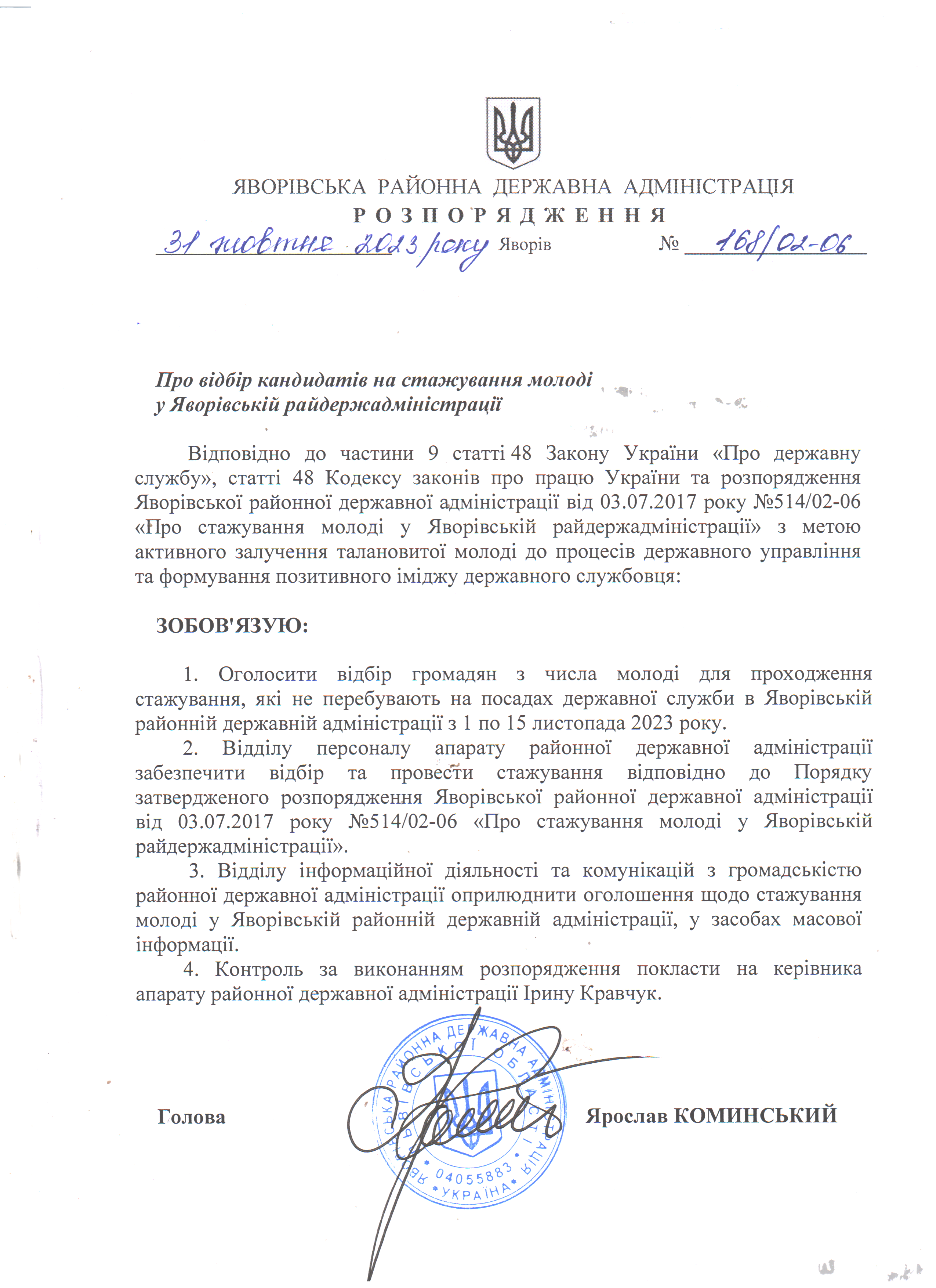 168/02-06 2023-10-31 Про відбір кандидатів на стажування молоді у Яворівській райдержадміністрації
