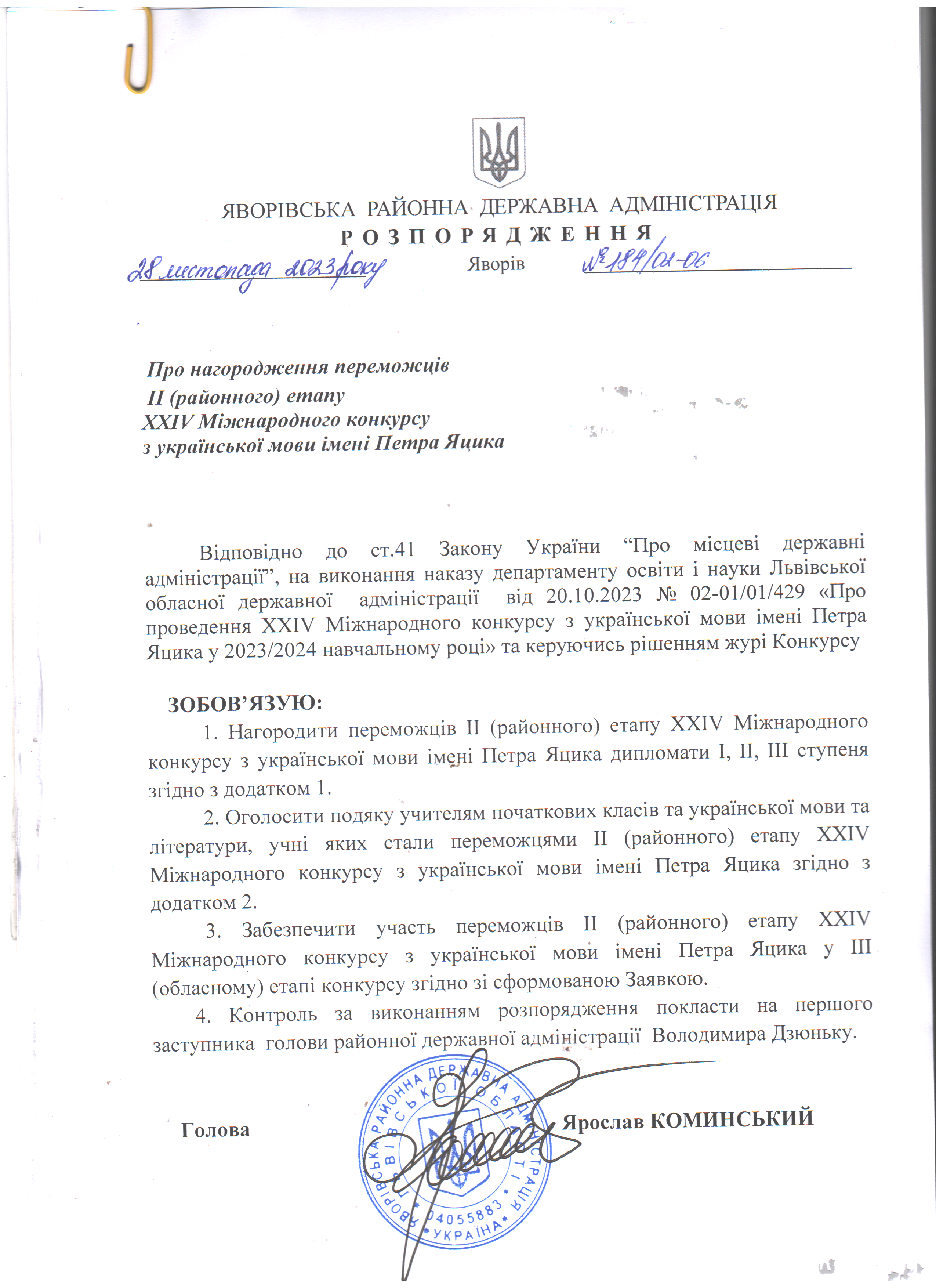 184/02-06 2023-11-28 Про нагородження переможців II (районного) етапу XXIV Міжнародного конкурсу з української мови імені Петра Яцика