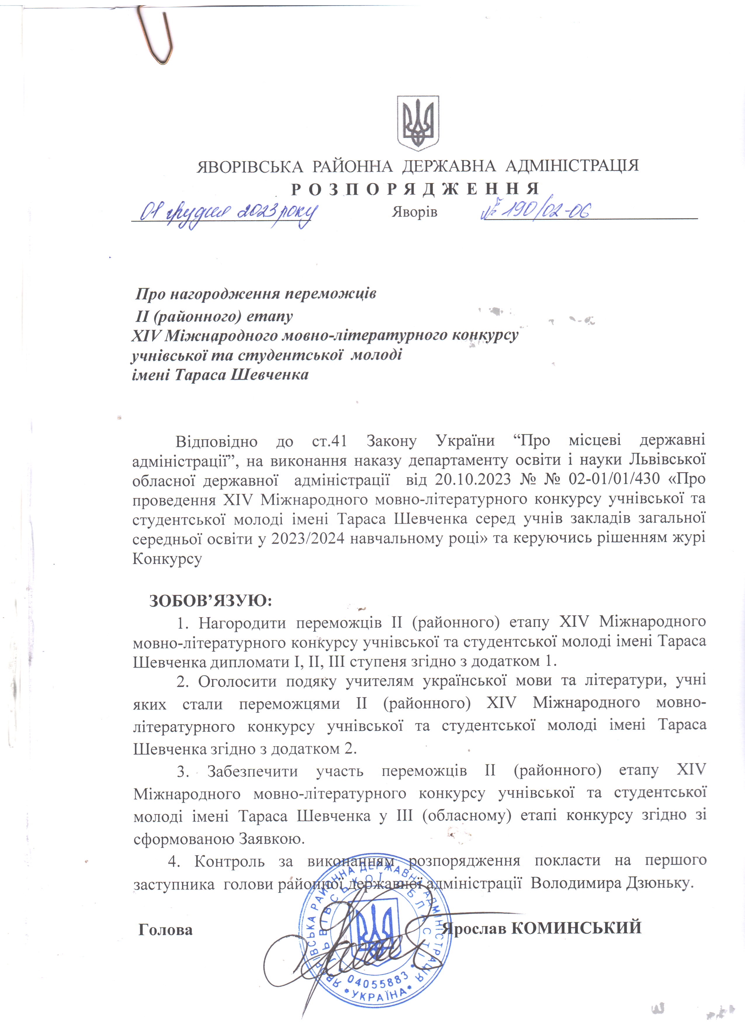 190/02-06 2023-12-01 Про нагородження переможців II (районного) етапу XIV Міжнародного мовно-літературного конкурсу учнівської та студентської молоді імені Тараса Шевченка