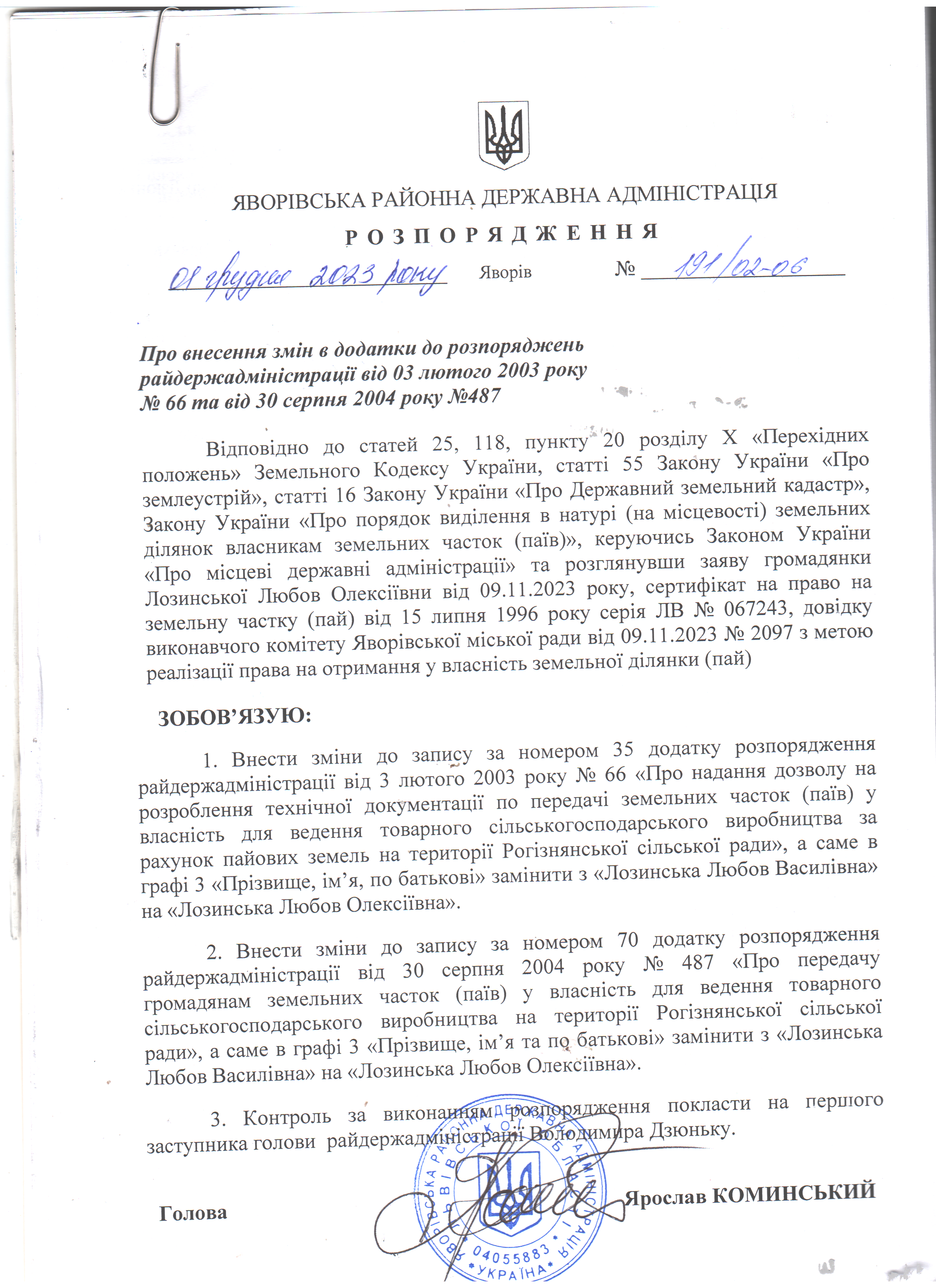 191/02-06 2023-12-01 Про внесення змін в додатки до розпоряджень райдержадміністрації від 03 лютого 2003 року №66 та від 30 серпня 2004 року №487