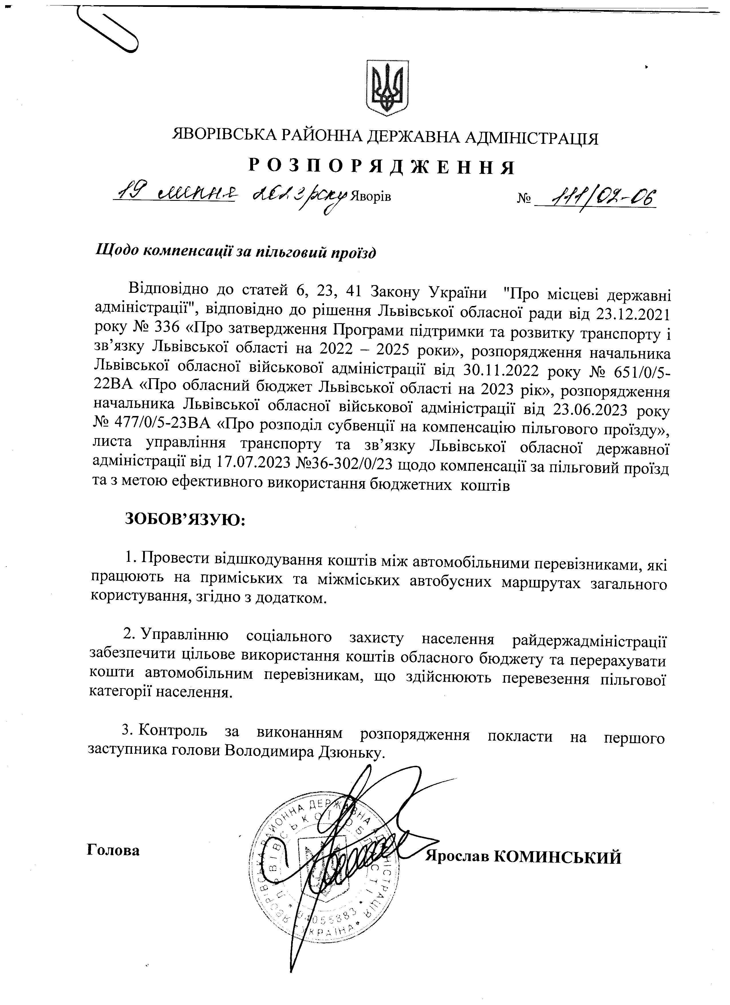 111/02-06 2023-07-19 Щодо компенсації за пільговий проїзд