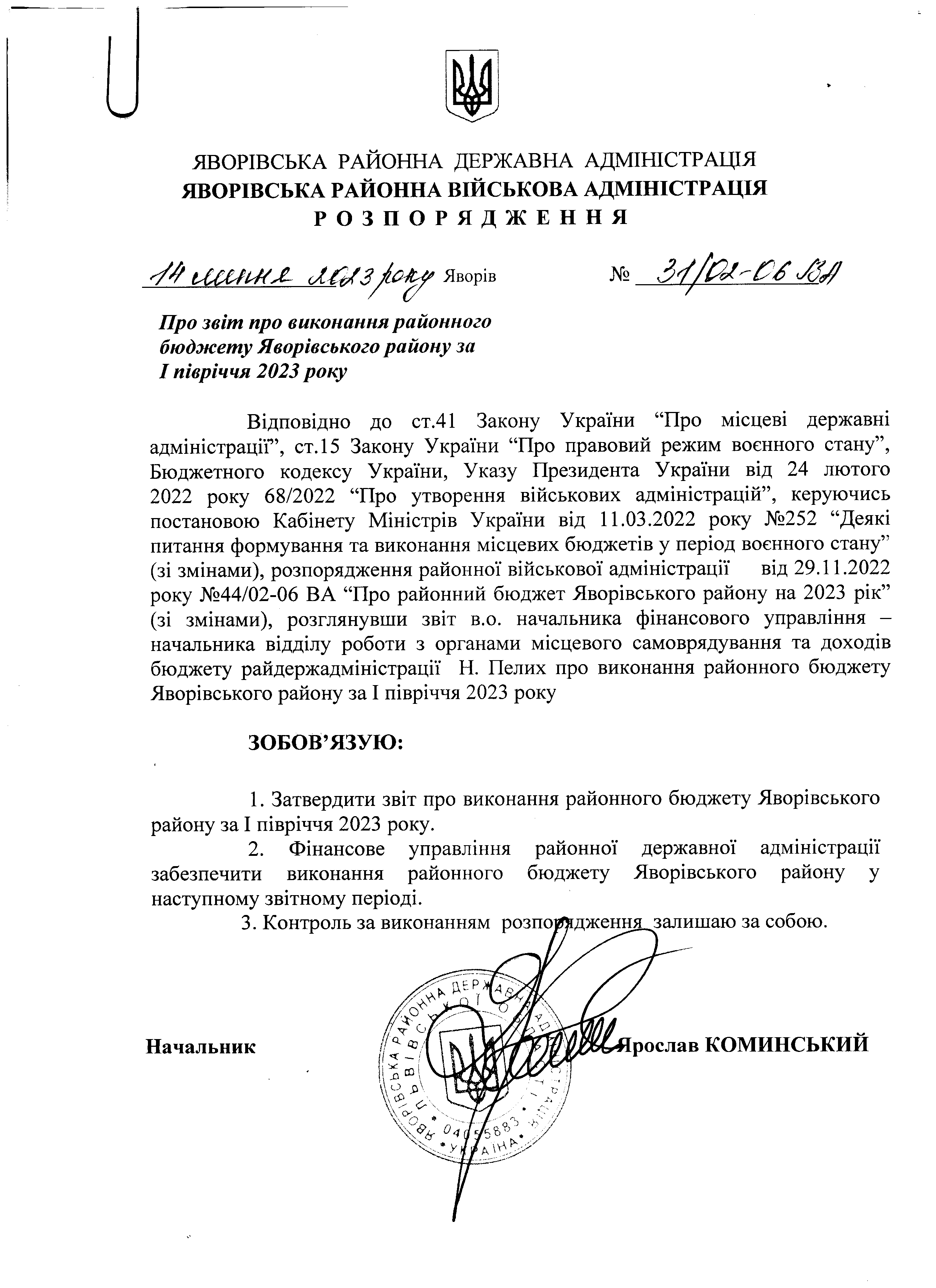 31/02-06 ВА 2023-07-14 Про звіт про виконання районного бюджету Яворівського району за I півріччя 2023 року