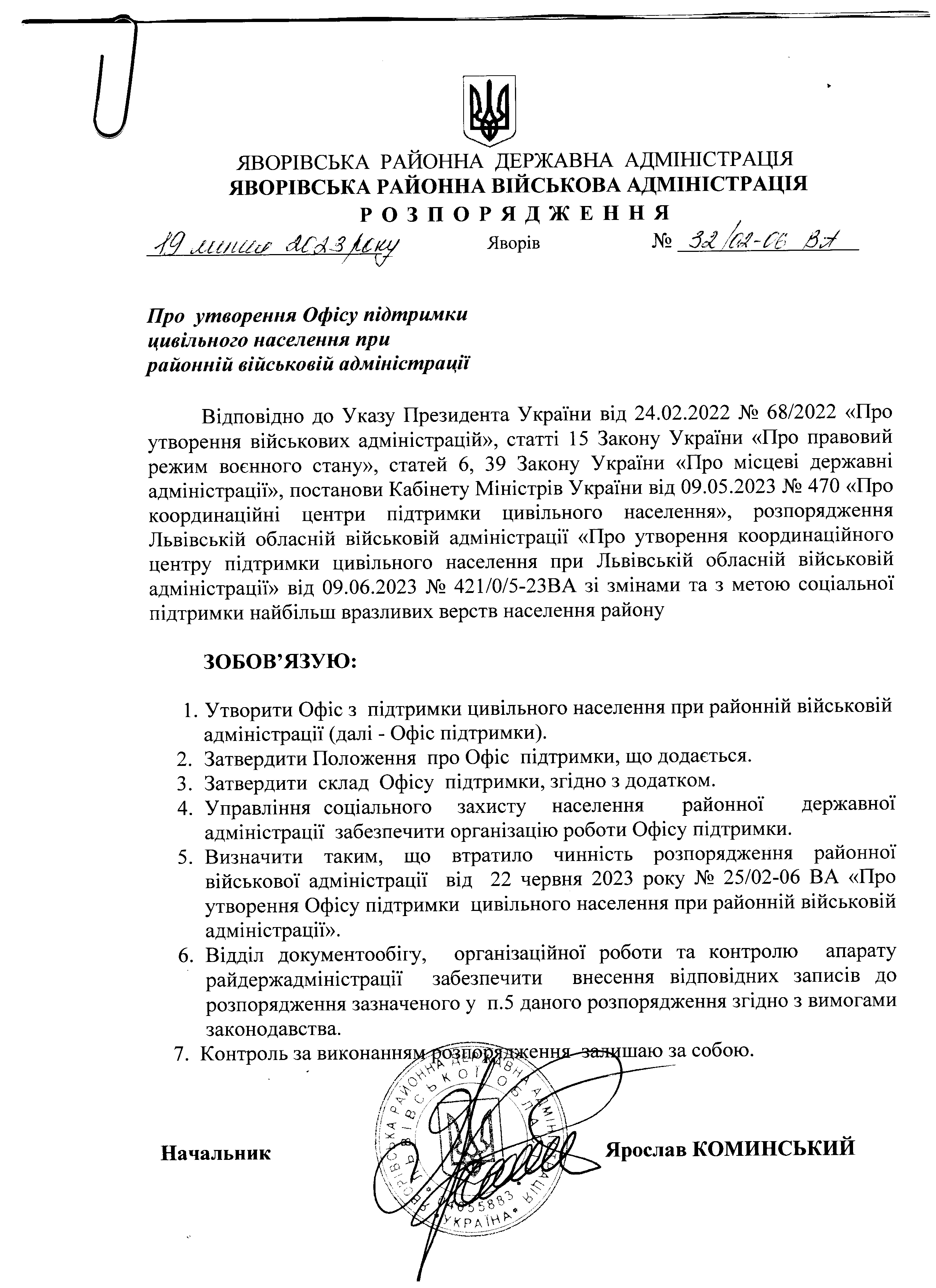 32/02-06 ВА 2023-07-19 Про утворення Офісу підтримки цивільного населення при районній військовій адміністрації